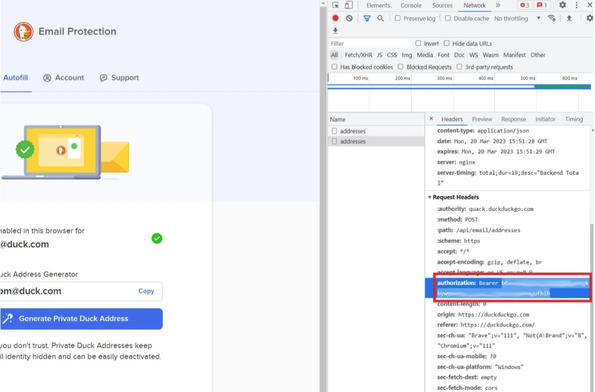 Cliquez sur ''adresses'' puis chercher le champ ''authorization: Bearer''. Si ''adresses'' n’apparaît pas, cliquez sur le bouton ''Generate Private Duck Adress''. Copiez la suite de lettres et de chiffres. C'est votre clé API