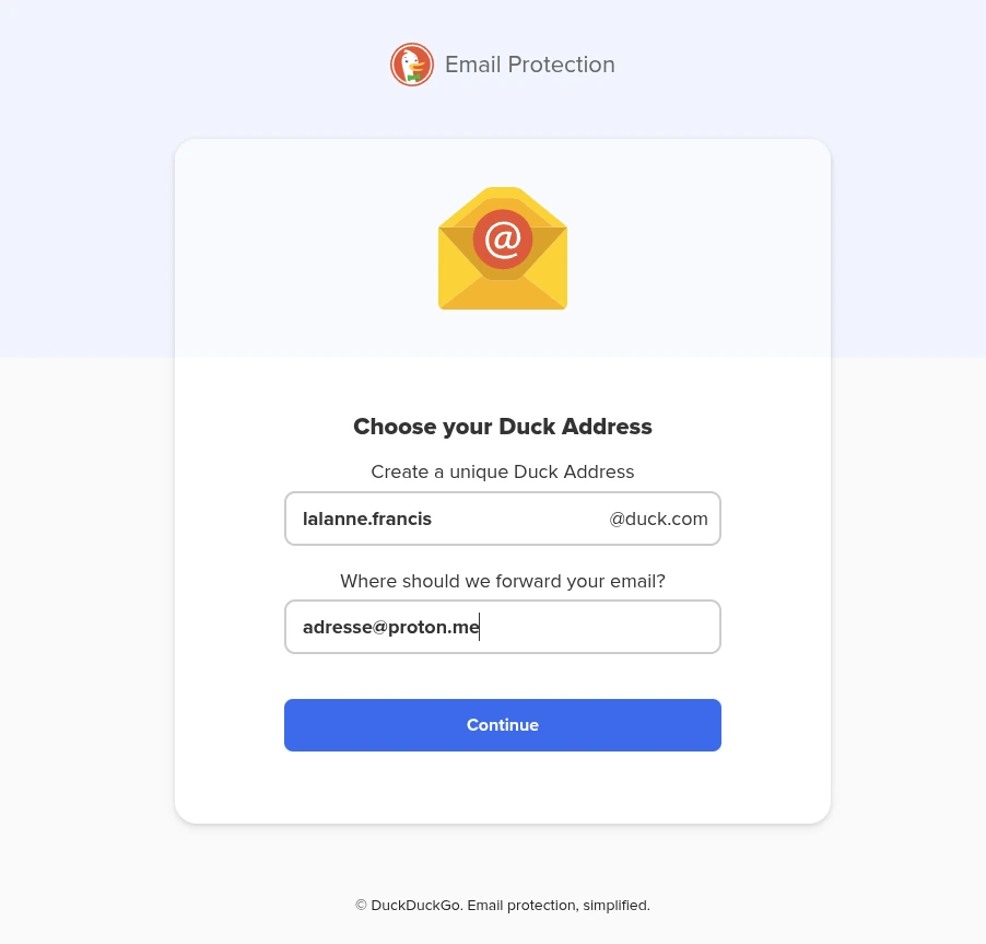 Une fois l’extension installée, rendez-vous sur https://duckduckgo.com/email/start et suivez les étapes.