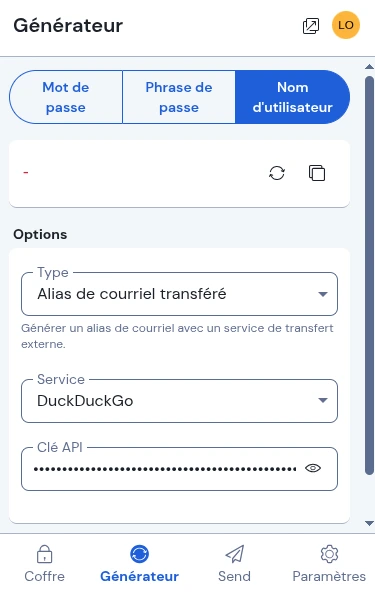 Ouvrir l’extension Bitwarden, allez dans l’onglet Générateur, puis Nom d’utilisateur.