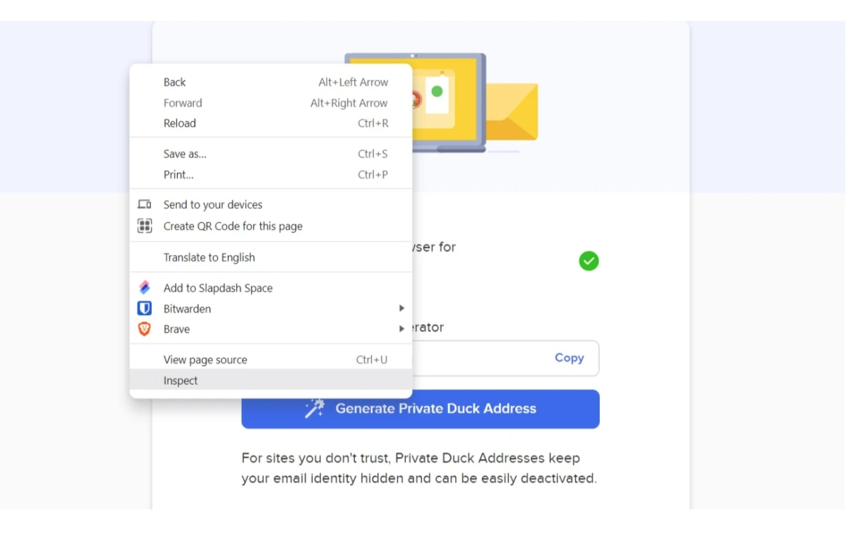 Clic droit sur le bouton ''Generate Private Duck Adress'' puis Inspecter